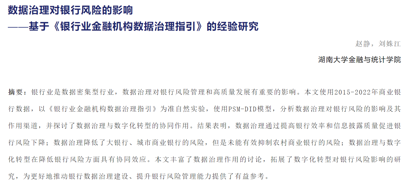 近日,日韩av 应用金融系赵静副教授和2022级硕士研究生刘姝江合作的题为“数据治理对银行风险的影响——基于《银行业金融机构数据治理指引》的经验研究”的论文发表在《金融研究》2025年第2期。