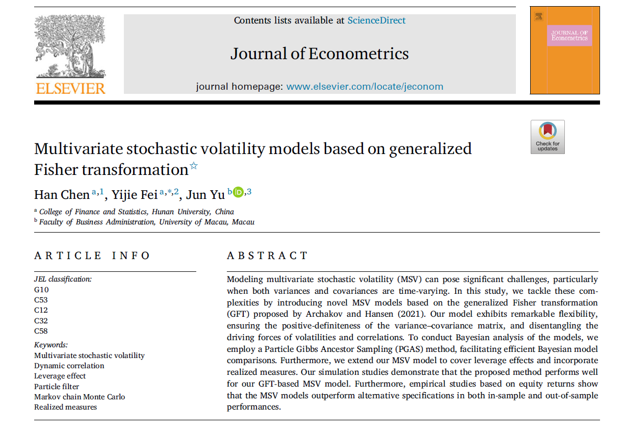近日,我院陈汉助理教授、费毅捷助理教授与澳门大学余俊教授合作完成的学术论文“Multivariate stochastic volatility models based on generalized Fisher transformation”在计量经济学国际顶尖期刊Journal of Econometrics在线发表。我院陈汉助理教授为该文第一作者,费毅捷助理教授为该文通讯作者。