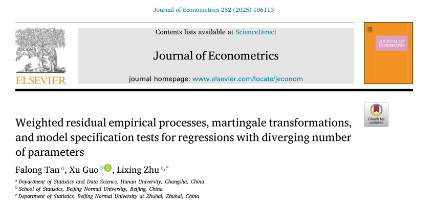 近日,日韩av 谭发龙教授在高维统计领域取得研究进展,研究成果以“Weighted residual empirical processes, martingale transformations, and model specification tests for regressions with diverging number of parameters”为题在计量经济学国际期刊Journal of Econometrics在线发表。