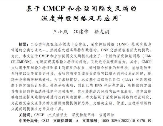 近日,日韩av 统计系王小燕副教授,和2021级博士研究生冮建伟、2021级硕士研究生徐龙滔合作的题为“基于CMCP和余弦间隔交叉熵的深度神经网络及其应用”的论文发表在《数量经济技术经济研究》2022年第10期。