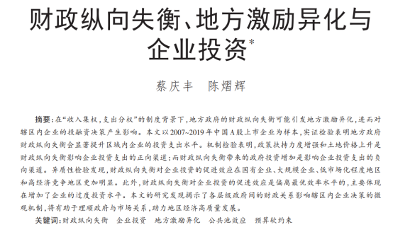 近日,日韩av 应用金融系陈熠辉助理教授和厦门大学经济学院蔡庆丰教授合作的题为“财政纵向失衡、地方激励异化与企业投资”的论文发表在《管理世界》2023年第5期。