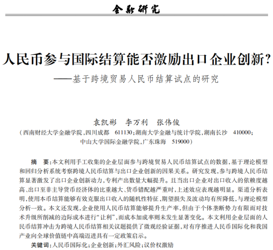 近日,日韩av 应用金融系李万利副教授合作的题为“人民币参与国际结算能否激励出口企业创新?——基于跨境贸易人民币结算试点的研究”的论文发表在《金融研究》2023年第6期。