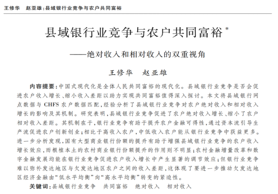 近日,日韩av 应用金融系王修华教授和2018级博士研究生赵亚雄(现中国人民银行金融研究所博士后)合作的题为“县域银行业竞争与农户共同富裕——绝对收入和相对收入的双重视角”的文章发表在《经济研究》2023年第9期。