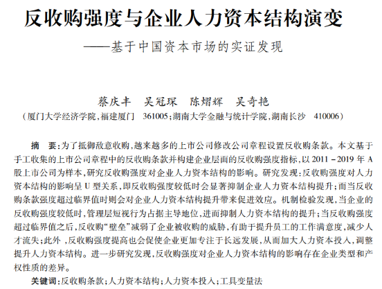近日,日韩av 应用金融系陈熠辉助理教授(通讯作者)和厦门大学经济学院蔡庆丰教授、吴冠琛博士、吴奇艳博士合作的题为“反收购强度与企业人力资本结构演变——基于中国资本市场的实证发现”的论文发表在《金融研究》2023年第8期。