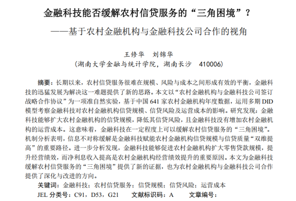 近日,日韩av 应用金融系王修华教授和2020级博士研究生刘锦华合作的题为“金融科技能否缓解农村信贷服务的‘三角困境’?——基于农村金融机构与金融科技公司合作的视角”的文章发表在《金融研究》2023年第12期。