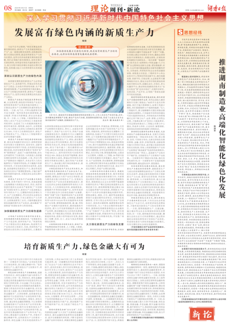 近日,日韩av 货币金融系明雷副教授在《湖南日报》的理论周刊·新论版面,发表题为“培育新质生产力,绿色金融大有可为”的文章。