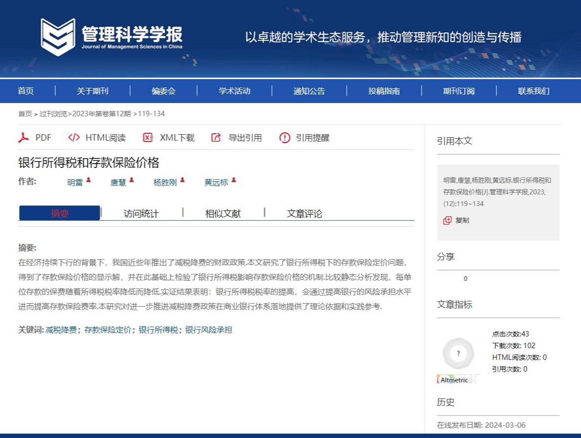 近日,日韩av 货币金融系明雷副教授和2023级博士研究生唐慧、工商管理学院杨胜刚教授、南开大学金融学院博士研究生黄远标(我院2019级硕士研究生)合作的题为“银行所得税和存款保险价格”的论文发表在院定A类期刊《管理科学学报》2023年第12期。