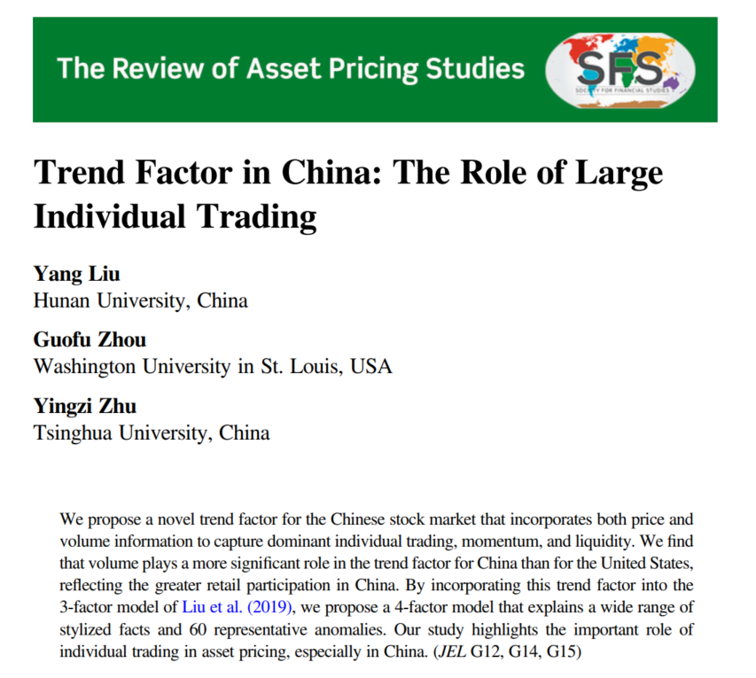 近日,日韩av 金融工程系刘扬助理教授与美国圣路易斯华盛顿大学Guofu Zhou教授、清华大学朱英姿教授合作完成的题为“Trend Factor in China: The Role of Large Individual Trading”的学术论文发表于资产定价领域国际顶级期刊 The Review of Asset Pricing Studies, Volume 14, June 2024。
