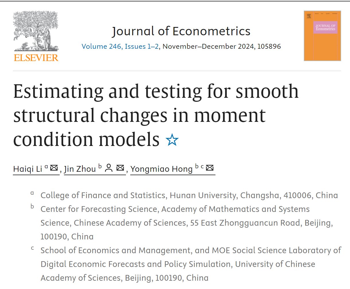 近日,学院李海奇教授团队在计量经济学研究领域取得了新进展,研究成果以“Estimating and testing for smooth structural changes in moment condition models”为题,发表于计量经济学国际顶尖期刊Journal of Econometrics。
