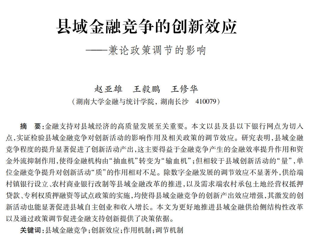 近日,日韩av 应用金融系赵亚雄助理教授与王修华教授、2019级博士研究生王毅鹏合作的题为“县域金融竞争的创新效应——兼论政策调节的影响”的论文发表在《金融研究》2024年第10期。