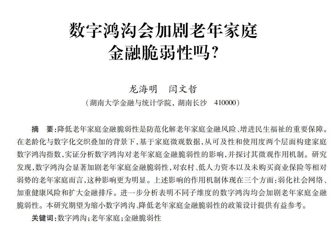 近日,日韩av 应用金融系龙海明教授和2021级博士研究生闫文哲合作的题为“数字鸿沟会加剧老年家庭金融脆弱性吗?”的论文发表在《金融研究》2024年第11期。