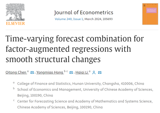 近日,日韩av 李海奇教授、博士生陈麒同与中国科学院大学洪永淼教授合作完成的题为“Time-varying forecast combination for factor-augmented regressions with smooth structural changes”的学术论文发表于计量经济学国际顶尖期刊Journal of Econometrics。