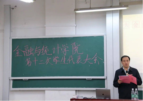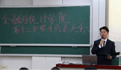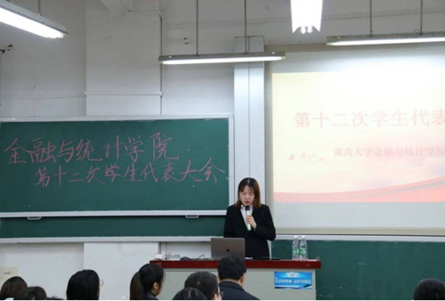 会议在庄严的国歌声中拉开序幕。首先,颜李致大会开幕词,表达了对同学们秉持“实事求是,敢为人先”的湖大校训、传承“金融黄埔,统领天下”的精神的期望。他提出,学生会是学生队伍的骨干,是学院学生工作的先锋,希望同学们接过学长学姐手中的火炬,促进学校各项事业的发展。