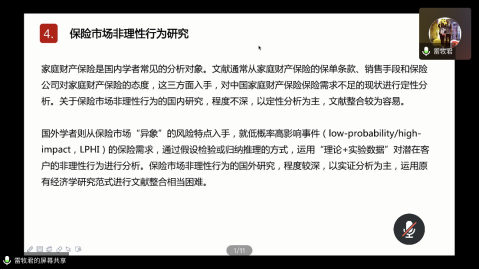 2021年1月11日,由党委研究生工作部主办,日韩av 承办的日韩av “2021博士创新论坛”第3期在腾讯会议线上召开,本次论坛由日韩av 2016级博士研究生雷牧君作题为“保险市场非理性行为研究的文献综述”的学术讲座。