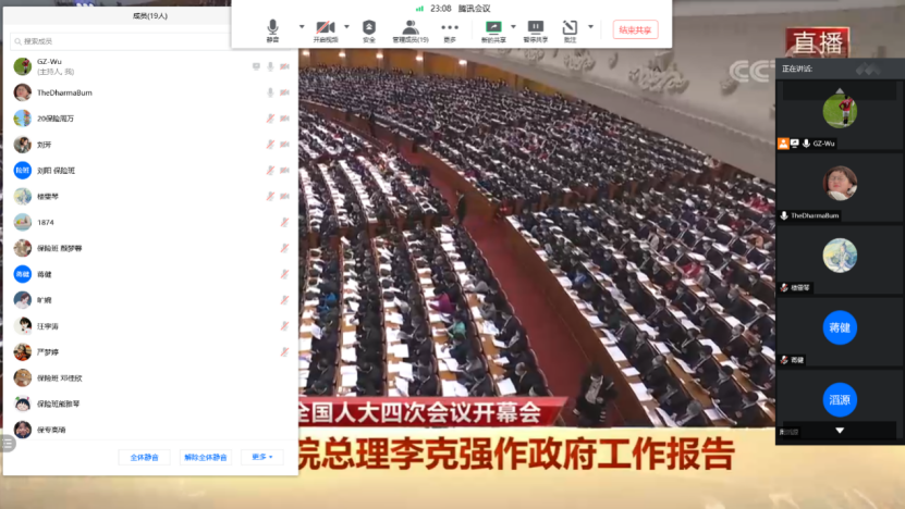 在完成学习任务的课余时间,有的班级以线下班会形式组织同学们集中观看“两会”实况;也有班级开展了线上会议,收看“两会”实况,阅读政府工作报告,进行交流与学习。