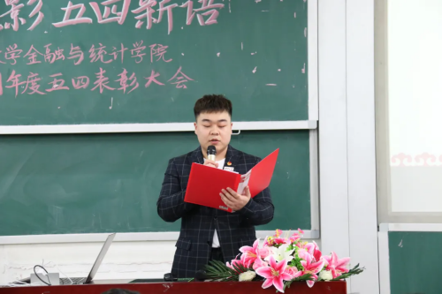 会上,荣获“五四红旗团支部”称号的统计2001班团支部和获得“优秀志愿者服务团队”项目代表金大团志愿者团负责同学进行风采展示。荣获“优秀团干”的代表姚飞宇同学、荣获“学风引领奖”的代表许筱颖同学发言。