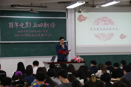 本次五四表彰大会于5月23日晚上7点在二教501举行,院党委书记黄红立,院党委副书记颜李,学工办主任谢君,团委书记范玉康,以及各年级辅导员老师们出席大会。