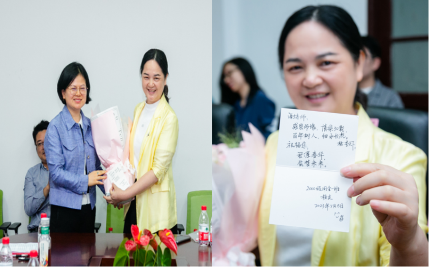 黄红立代表学院向谢君颁发荣誉证书和奖杯,校友代表李福田献花。黄红立表示,谢君老师在辅导员岗位坚守三十年是非常不容易的,她给全体辅导员老师树了榜样,立了标杆。希望广大辅导员和老师们可以向谢老师看齐,想学生之所想,用心用情关心爱护帮助学生,培养更多堪当新时代民族复兴大任的高质量人才!