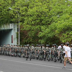8月27日早上七点半,随着教官的一声哨响,财院校区2022级的新生们正式开始了军训拉练活动。学生以两路纵队出发,排头两名男生负责举旗。鲜红的旗帜彰显着气势,新生斗志昂扬,精神饱满,怀着满腔的热情。