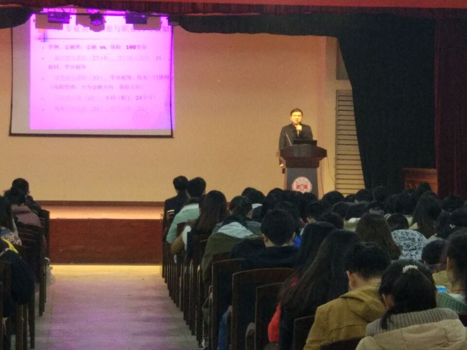 13时50分未到,学校大礼堂便已经座无虚席,随后,辅导员李少珊老师宣布会议正式开始,并请吴副院长进行谈话。吴副院长开门见山,一开始就提出了四个问题:为什么要进行大类招生,专业类、专业、职业之间有什么关系,怎么样选择专业以及进一步的安排。然后吴副院长对这些问题一一进行了详细的解答。针对第一个问题,他形象地比喻成了供给侧的改革强调大类招生可以增加我们每个人的职业弹性;针对第二个问题,他讲到“由专业类到专业的过程其实就是一个触类旁通的过程。”提出要重基础,宽口径。专业类可以更好的适应近年来的职业流动,专业分流是一个贴标签,一个更窄的学习方式。然后进一步的讲述了金融与保险专业的专业修课计划,最后提出金统院专业之间是一种相互就业,交叉就业的关系。针对第三个问题,院长就如何选择专业给我们在座的学生提出了三条宝贵的建议。第一条就是:要全面收集信息,做到心里有数不盲从。第二是我们的选择要立足于整个经济发展趋势,顺应行业的发展周期,从一个长远的角度来看待这个问题。第三则是要充分利用自己的优势与特长,运用好身边现有的资源进行选择。最后院长则是讲了一下金统院专业分流的具体安排。紧接着,随后,刘周平书记对专业分流进行指导,提示同学们要慎重选择,以及保研考研对专业的重要性,还提醒去国外读研也不失为一个好的选择。在会议的最后,辅导员李少珊老师提醒同学们关注教务处通知动态,并在周五前上交专业选择结果。