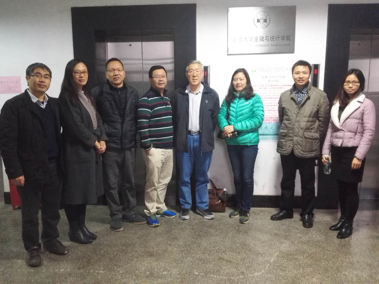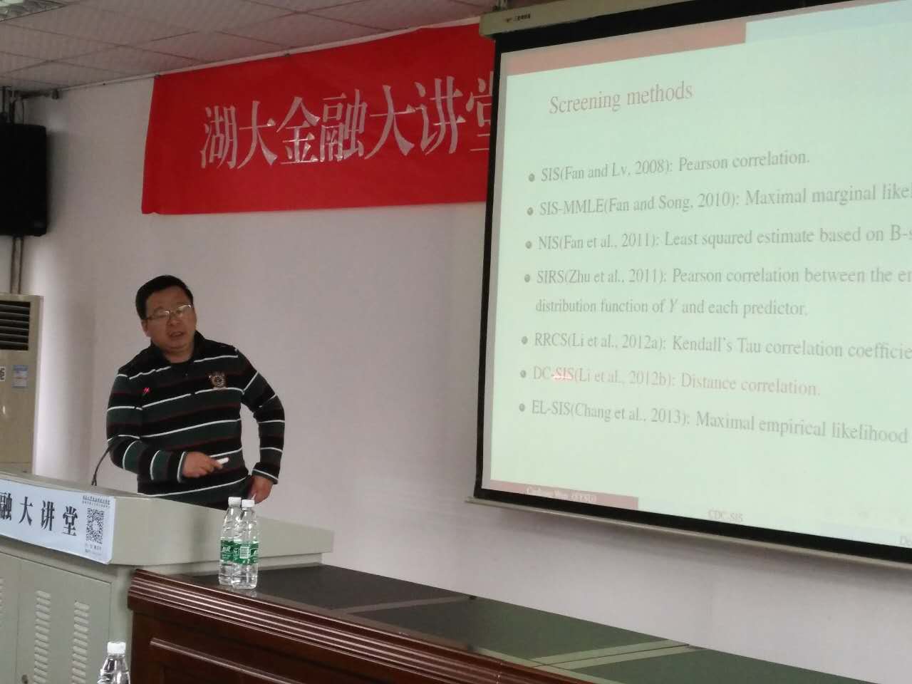全国工业统计学教学研究会2016年会于2016年12月2日至5日在湖南长沙召开,本次会会议由我院承办。来自全国20余所高校和研究机构的30多名专家学者参加了此次会议。会议主题是大数据与统计、高维数据处理。2016年12月2日下午,会议的四位特邀嘉宾在我校财院校区行政楼301会议室做了专题报告。中山大学数学学院王学钦教授报告题目:《SURE INDEPENDENCE SCREENING ADJUSTED FOR CONFOUNDING COVARIATES WITH ULTRAHIGH DIMENSIONAL DATA 》;武汉大学数学与统计学院刘妍岩教授报告题目:《Censored Cumulative Residual Independent Screening for Ultrahigh-Dimensional Survival Data》;广州大学经济与统计学院张崇岐教授报告题目:《Additive Mixture Designs with Heteroscedastic》;武汉大学数学与统计学院刘莉副教授报告题目:《Analysis of Missing Data in Generalized Linear Models with Random Effects》,我院老师和研究生约60人参加了报告会,大家一致认为收获很大,是一场精彩的学术报告。
