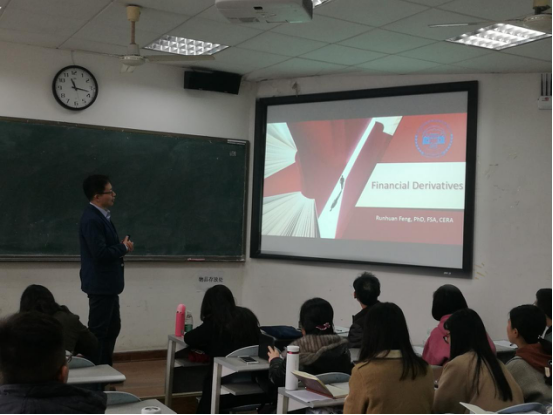12月24日上午10点在日韩av 财院校区水教302,美国伊利诺伊大学香槟分校终身副教授兼精算项目主任冯润桓博士应邀前来做题为《投资连结保险中的投资担保风险工程》的讲座以,陈迪红副院长、张琳教授、张宁系主任、刘革副主任、杨卫平副教授以及18级保险研究生参加了本次讲座。讲座由张宁系主任主持。