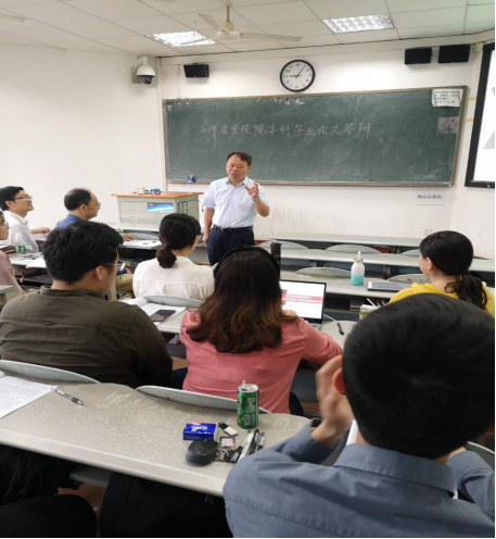 在答辩现场,段献忠校长表示,这是第一次观摩本科论文答辩,非常高兴能够借此答辩机会来看望同学们。人才培养质量是学校的生命线,毕业论文作为深化、拓宽、综合运用所学知识的重要过程,既是学生大学四年所学专业知识的全面总结和检验,也是培养一个学生良好的学习态度和学术研究精神的好方式,还是对各专业人才培养理念和培养目标达成的一个重要考察和反馈。他说,金统院有一批以肖钢为代表的杰出校友,有“金融黄埔”之称,本科人才培养工作做得相当扎实。同时,希望我院的学生在今后的工作中,特别是面临中美贸易战的情况下,在金融方面的竞争压力下,能够不断前行,为金融行业的发展,做出更大的贡献。