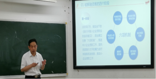 2019年6月13日周四下午3:00, “业界精英进校园系里活动”之《中小微企业融资难(贵)的症结与化解之道》在二教304成功举行,主讲人为我院优秀校友,中国农业银行湖南省分行公司业务部粟青副总经理。