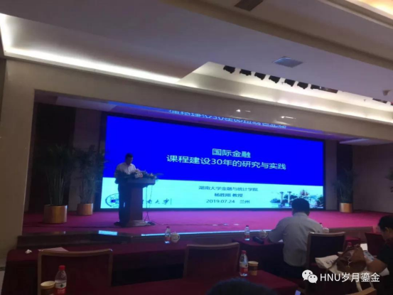兰州财经大学校党委书记傅德印教授、河南财经政法大学校长高新才教授、甘肃省教育厅高等教育处副处长姜言卿、高等教育出版社经管分社副社长郭金录分别致辞。研讨会上,杨胜刚教授与胡金焱教授、邹新月教授、李建军教授、刘莉亚教授、梁琪教授等5位教育部金融类专业教指委委员以及其他6位一线的教学科研名师受邀发言。其中,杨胜刚教授发言的题目是“传承+创新、精品+共享:《国际金融学》三十年课程建设的理论与实践”。