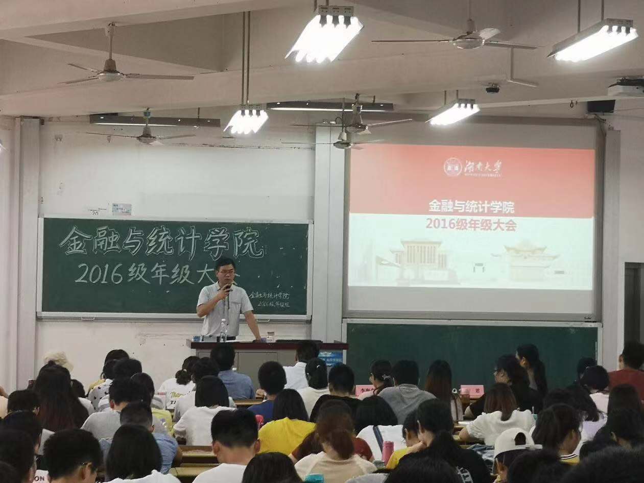 会议伊始,党委书记聂国军上台发言。聂书记介绍了自己从1990年以来在湖大的工作经历,并希望同学们热爱自己的母校、热爱自己的母院,日韩av 是千年学府、百年名校,日韩av 更是金融黄埔,我们要以母校为自豪。同学们要完善对自己的定位和职业规划,选择正确的赛道。同时也鼓励大家毕业后攻读名校博士或者去各大金融机构的总部工作。聂书记说:“祝贺大家经过自己的努力奋斗成熟了,思想稳健了,如何进一步走上职场,进一步深造,这次年级大会关乎学生未来选择。每走一步都要基于当地金融的发展,中国的金融发展,而不仅仅是小家幸福。”