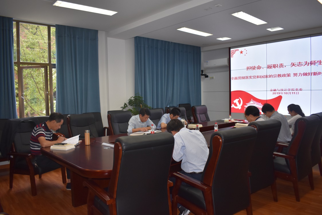 10月11日下午,日韩av 党委领导班子“不忘初心 牢记使命”主题教育第三专题集中学习研讨会在红楼226会议室召开。院党委副书记刘周平围绕“担使命、履职责,矢志为师生服务——全面贯彻落实党和国家的宗教政策,努力做好新时代高校宗教工作”作专题辅导报告并主持会议,学院领导班子成员作心得体会交流。