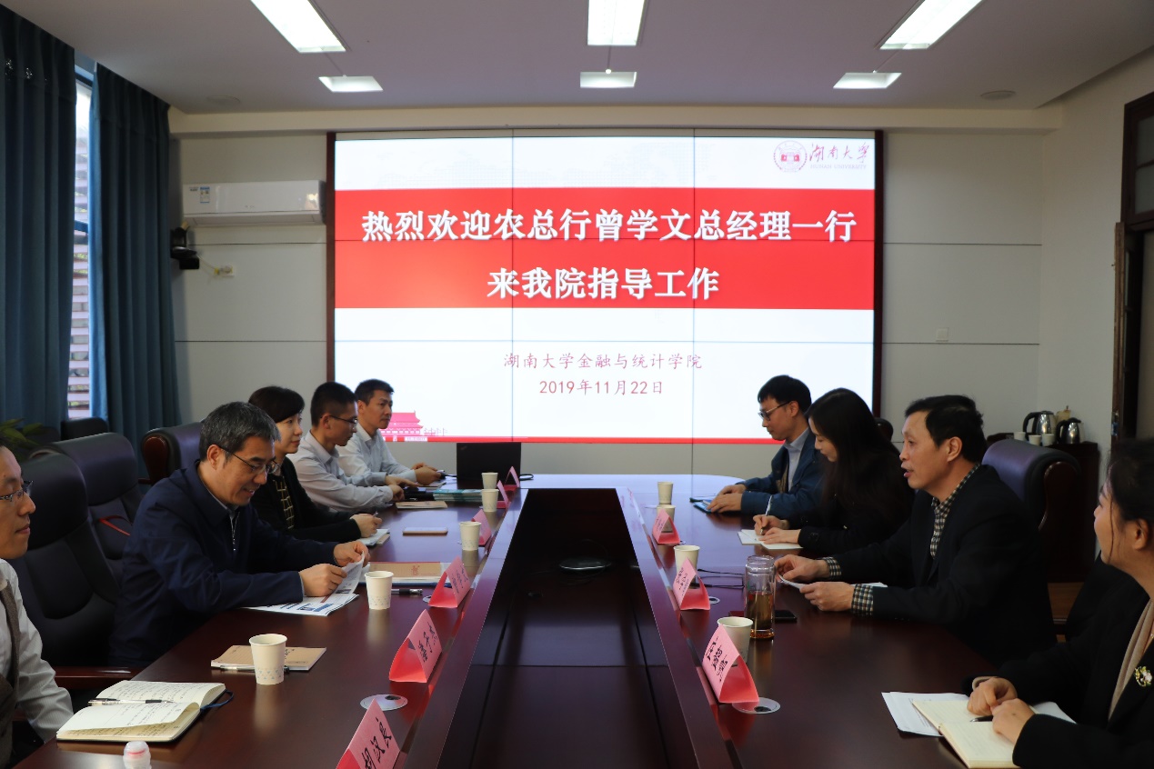 11月22日下午四点,中国农业银行博士后科研工作站宣讲会活动在日韩av 财院校区日韩av (红楼)226会议室顺利召开。中国农业银行总行战略规划部总经理曾学文、战略规划部零售战略创新处处长张燕姣、战略规划部数字化转型办公室秘书处高级专员潘子杰、博士后科研工作站博士后闫洪举,中国农业银行湖南省分行办公室主任胡汉良、孟建平,金统院副院长王修华,金统院校友工作办公室主任张学陶,副主任黄山,辅导员庄韫帆、黄漪旖出席本次会议。此外,与会成员还有各届优秀的在读博士生。会后金统院党委书记聂国军与农总行一行就战略合作、人才培养进行更深入的交流。