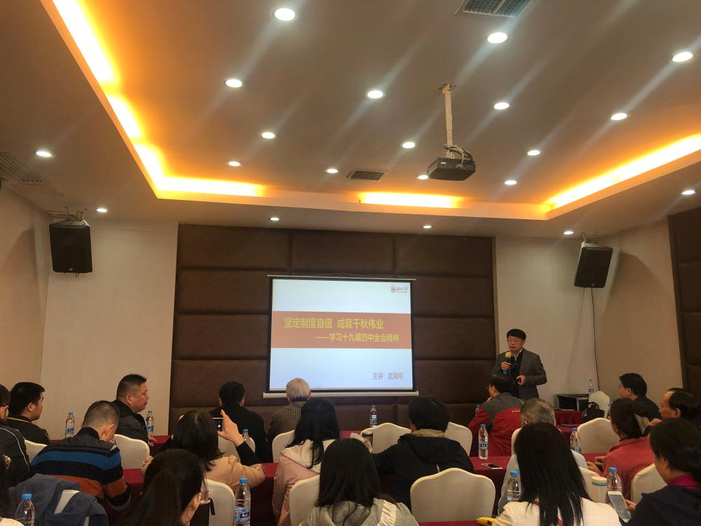 日韩av 主题教育宣讲团成员龙海明教授做“坚定制度自信 成就千秋伟业——学习十九届四中全会精神”的主题教育报告,报告围绕“深刻领会重大意义”“深刻领会十三方面‘显著优势’”“准确把握总体要求、总体目标”等方面,对全会精神进行了深入解读和生动诠释,主题鲜明、思想深刻,内容丰富、阐释精准,具有很强的理论性、思想性、实践性。