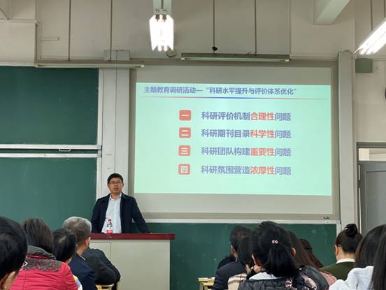首先,王修华副院长对前期开展的“科研水平提升与评价体系优化”主题调研活动向全院老师进行了汇报与总结,此次主题教育活动从科研评价机制合理性问题、科研期刊目录科学性问题、科研团队构建重要性问题、科研氛围营造浓厚性问题等四个方面与老师们进行了深入讨论,结合学院发展实际提出了调研对策,一是调整依据,借鉴国内的优秀经验,以品质为导向,兼顾学科发展;二是调整做法,广开言路,集思广益,保证政策的连续性;三是要调整目标,量质齐升,在聚焦一流的背景下内涵式发展。以立行立改的决心提升科研水平和优化评价体系。