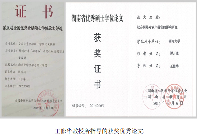 同样,王老师也非常注重研究生的人格塑造和能力培养,他在研究生开学典礼上畅谈了自己关于做人、做学问的体会。做人,要坚守踏实和诚实两种品质,要处理好合作和竞争两种关系。做学问,要夯实研究方法和文字功底两个基础关,要秉持锲而不舍的探索精神和敢于质疑的创新精神。他指导的研究生不负期望,在《数量经济技术经济研究》、《Applied Economics》、《Economics of Governance》等国内外重要期刊发表学术论文多篇,获得湖南省优秀硕士论文、全国优秀金融硕士论文提名等荣誉。他希望自己的学生走出校门后,能够传承和发扬好“金融黄埔”精神,实现人生理想抱负。对即将毕业的弟子,他曾在博客中寄语:爱徒马上踏上人生新征程,送一句我特别喜欢的座右铭与大家共勉——想今朝,大鹏展翅恨天低;待来年,扶摇直上冲九天!
