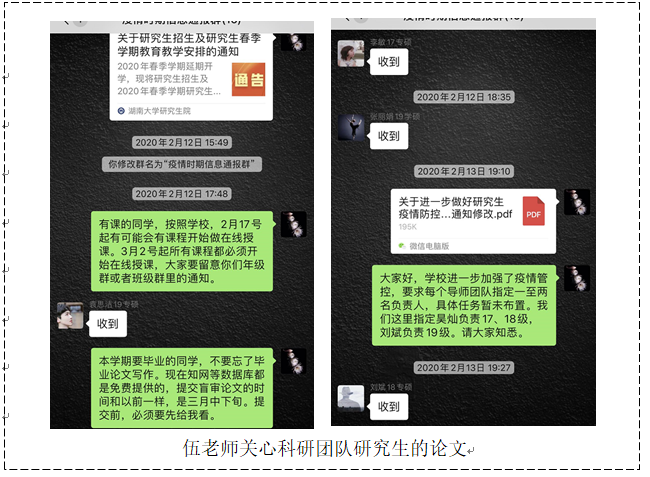 不仅如此,疫情防控期间,伍老师对于研究生的论文指导也十分上心,不愧是先后四次获得“日韩av 毕业设计(论文)优秀指导老师”称号的优秀教师。目前,伍老师正在指导15位研究生,其中不乏即将毕业的数名研究生。疫情防控期间,伍老师多次运用邮件、微信指导各位研究生的论文,孜孜不倦地教育着祖国未来的建设者。