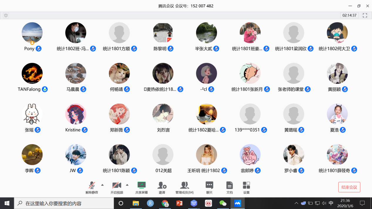 因受新冠肺炎疫情影响,日韩av 18级统计类学生专业分流宣讲会利用腾讯会议APP在线上召开。3月6日晚上7:30-10:00,统计学系18级全体学生与业界、学界及毕业生代表嘉宾们共聚专业分流线上宣讲会。共有84人参加了线上宣讲会,其中业界嘉宾为湖南省统计局郭文峰处长;学界嘉宾有金统院副院长李海奇,院学科建设办公室主任张立军,院工会主席曾昭法,统计学系党支部书记谭朵朵、系主任谭发龙、副系主任王小燕和马守荣,以及周四军教授、任英华教授、陈黎明副教授和王瑛副教授,18级辅导员夏浩老师和院教务办李晖老师;优秀毕业生代表为18届毕业生祝嘉雪、19届毕业生陈兆阳和黄丽颖。