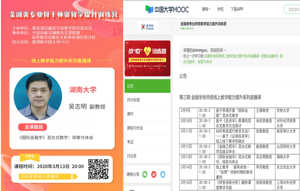3月13日,在爱课程网中国大学慕课,作为日韩av 国际金融课程团队的代表,我院副院长吴志明老师直播分享混合式教学经验,他讲授的题目是“《国际金融》混合式教学:探索与体会”。