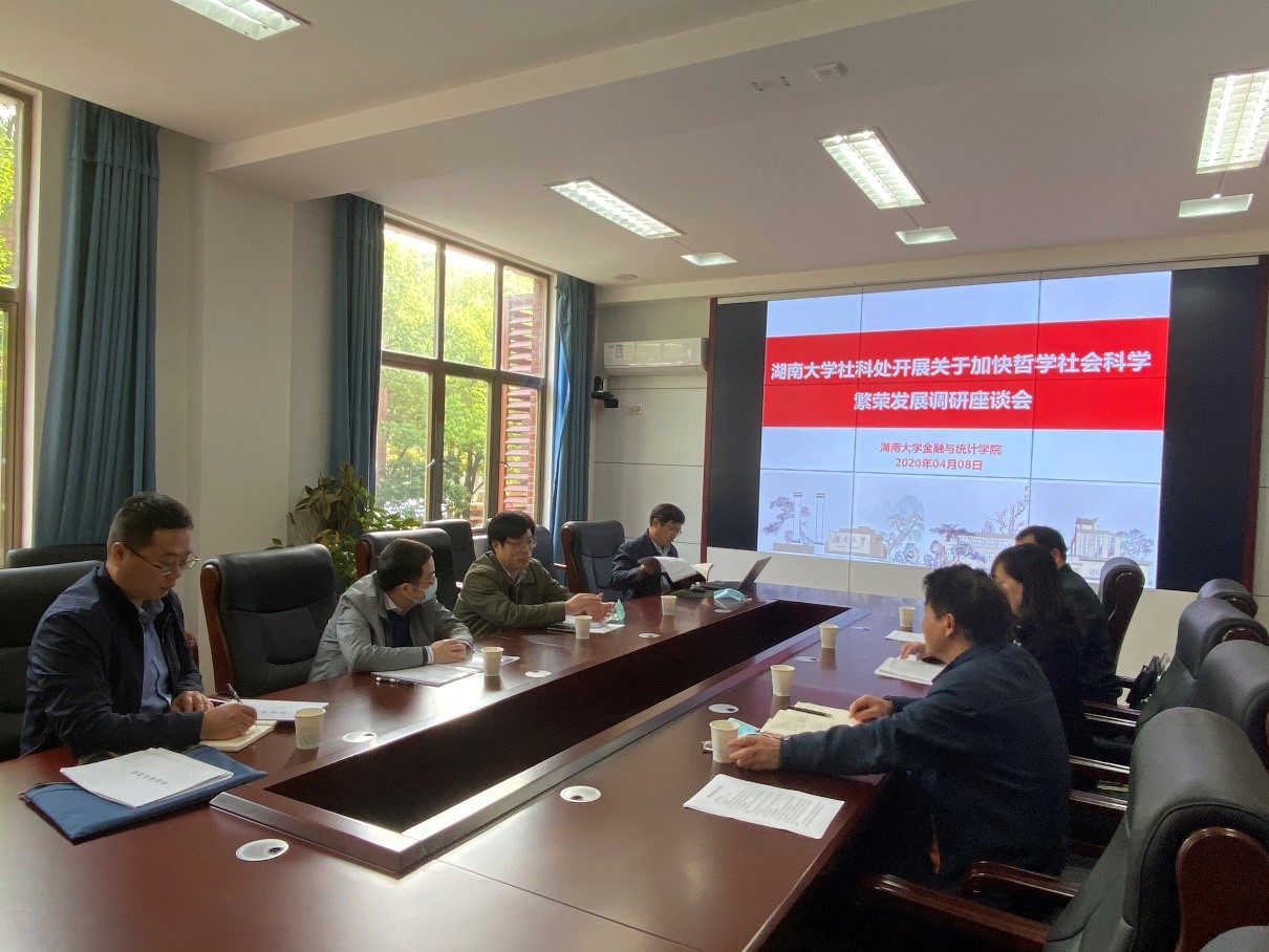 2020年4月8号下午,日韩av 副校长谢赤、社科处处长侯俊军、副处长李恩军、社科处鲁丽梅老师、周文杰老师等一行来学院就关于加快哲学社会科学繁荣发展主题开展调研。学院党委书记聂国军、副院长王修华、科研秘书吕亚妮出席座谈会。