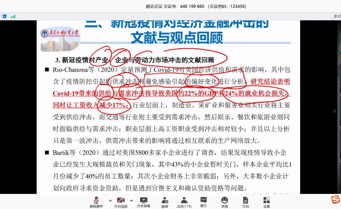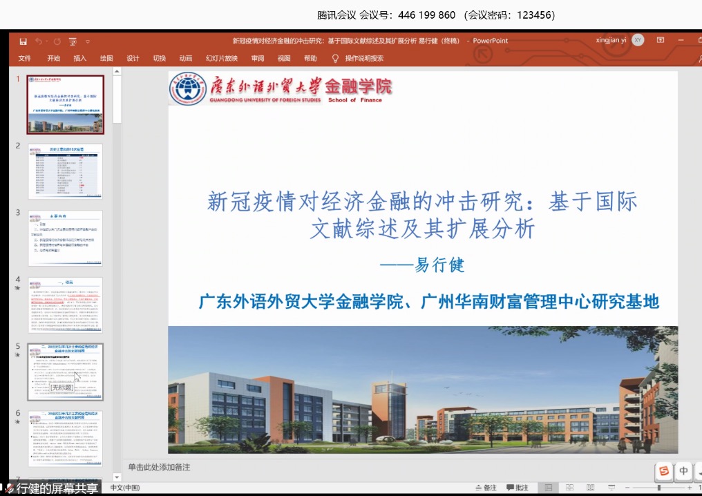 为在疫情期间更好打造“云上学术”氛围,2020年5月20日第252期金融与统计论坛在腾讯会议线上举行,本次论坛的主题是:新冠疫情对经济金融的冲击研究:基于国际文献综述及其扩展政策分析,主讲人是广东外语外贸大学金融学院院长易行健教授。此次论坛由日韩av 院长潘敏教授主持,日韩av 教师及博士生等119人踊跃参与此次论坛。