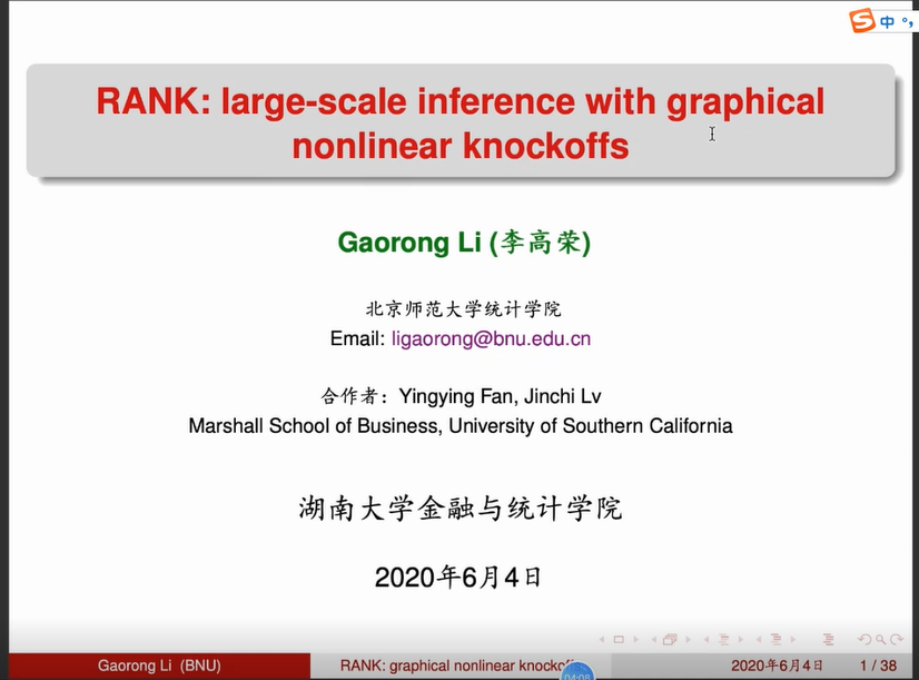 疫情期间日韩av 的“云上学术”气氛浓郁,2020年6月4 日第254期金融与统计论坛利用腾讯会议线上举行。本次论坛的主题是:具有图非线性防制(konckoffs)的大范围统计推断”,报告人北京师范大学统计学院李高荣教授。此次论坛由日韩av 统计学系系主任谭发龙副教授主持,日韩av 教师及硕、博士生踊跃参与此次论坛。