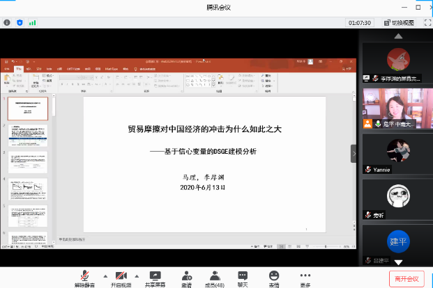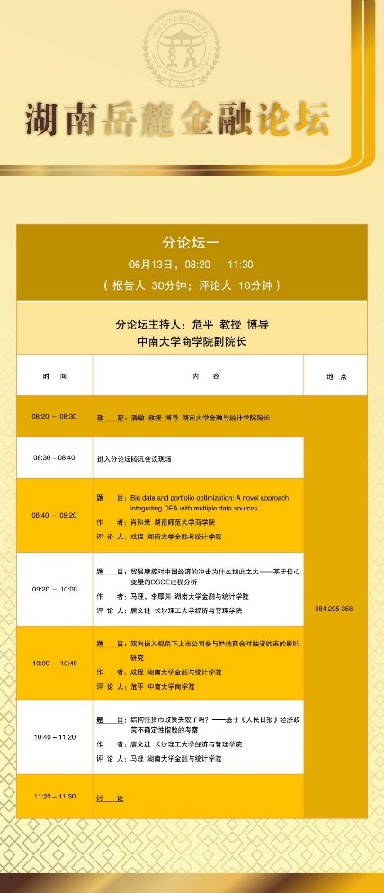 分论坛一由中南大学商学院副院长危平教授主持。首先是湖南师范大学商学院的肖和录助理教授汇报论文《Big data and portfolio optimization: A novel approach integrating DEA with multiple data sources》,通过对大数据和投资组合优化,介绍了一种将DEA与多源数据集成的新颖方法;接下来由日韩av 马理教授汇报《贸易摩擦对中国经济的冲击为什么如此之大——基于信心变量的DSGE建模分析》,研究构建了开放经济条件下的DSGE模型,论证信心变量在贸易摩擦传导过程中的重要作用;接下来由日韩av 成程助理教授汇报《双向嵌入视角下上市公司参与异地商会对融资约束的影响研究》,通过分析异地商会双向嵌入的社会属性和现实功能出发,将2008—2018上市公司高管向异地商会捐款和担任异地商会职务的数据与上市公司财务数据进行匹配,验证上市公司参加商会对公司融资约束的影响。最后由长沙理工大学经济与管理学院唐文进教授汇报《结构性货币政策失效了吗?——基于人民日报经济政策不确定性指数的考察》,本文从企业杠杆率视角,利用人民日报经济政策不确定性指数以及2013年第一季度至2019年第二季度A股上市公司及宏观经济的匹配数据探究其原因,发现结构性货币政策依然有效,但经济政策不确定性对结构性货币政策的实施效果由于信心渠道产生了较大干扰。