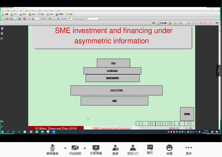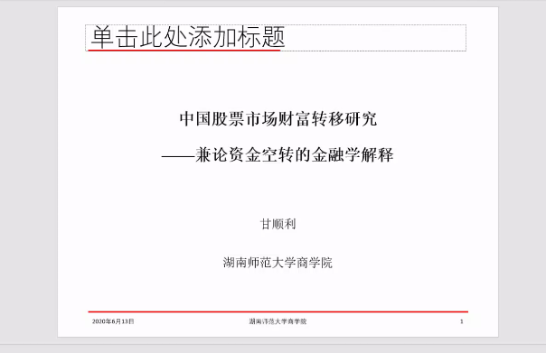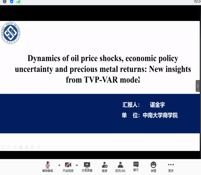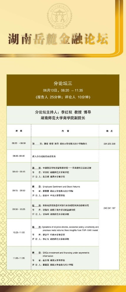 分论坛三由湖南师范大学商学院副院长李红权教授主持,首先由湖南师范大学商学院甘顺利助理教授汇报《中国股票市场财富转移研究——来自股权交易的证据》,本文以2007年第1季度至2019年第4季度中国上市公司股权交易为研究对象,估算了资金空转的收益,并考察了资金空转收益的决定因素;接下来由日韩av 唐国豪助理教授汇报《Employee Sentiment and Stock Returns》,文章提出了员工情绪指数,作为投资者情绪与经理人情绪的补充,并在样本内和样本外发现了高员工情绪指数能够负向预测未来股票收益;接着湖南工商大学财政金融学院胡锡亮助理教授汇报《实体经济债务违约对银行业系统性风险的影响研究》,本文基于Merton(1974)的标准CCA方法,分析了实体经济债务违约对银行业系统性风险的非线性激增机制,明晰了Nagel & Purnanandam(2020)修正CCA方法嵌入的银行股权与负债“期权的期权”与银行资产收益非线性特征;接下来由中南大学商学院谌金宇副教授汇报《Dynamics of oil price shocks, economic policy uncertainty and precious metal returns: New insights from TVP-VAR model》,基于时变参数矢量自回归(TVP-VAR)模型,研究使用1990年4月至2018年4月的月度数据,着重分析了油价冲击和经济政策不确定性对贵金属收益的动态影响;最后由湘潭大学商学院赵志明助理教授汇报《SMEs investment and financing under asymmetric information》,研究在信息不对称的动态环境中受财务约束的中小企业的投资时机和融资决策。