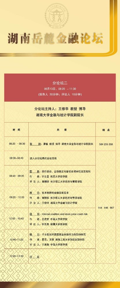 分论坛二由日韩av 副院长王修华教授主持。首先由长沙理工大学经济与管理学院谢朝华副教授汇报《技术创新的金融发展需求》,认为金融业在结构、功能、效率和安全等四个方面还有较大的发展空间和较强的紧迫性,金融服务技术创新需要练好四大基本功;接下来由湘潭大学商学院许先普副教授汇报《房价波动、金融稳定与最优宏观审慎政策规则》,研究基于植入金融因素的房价波动DSGE模型,分析了不同宏观审慎工具对房价波动的调控效果、作用机制以及最优政策组合等问题;接着由中南大学商学院的王建新副教授汇报论文《Internal coalition and stock price crash risk》,文章检验了内部结盟对2000至2014年间股票崩溃风险的影响,基于任命的内部结盟对股票崩溃风险有正向和重大影响;最后由湖南工商大学财政金融学院王韧教授汇报论文《子女性别对家庭商业保险行为的影响研究》,本文运用Probit和Tobit回归的方法,利用2013年、2015年及2017年三年中国家庭金融调查截面数据研究了家庭对于商业保险投资在一定程度上存在对子女的性别偏好的问题。