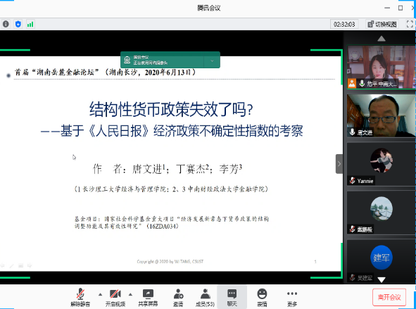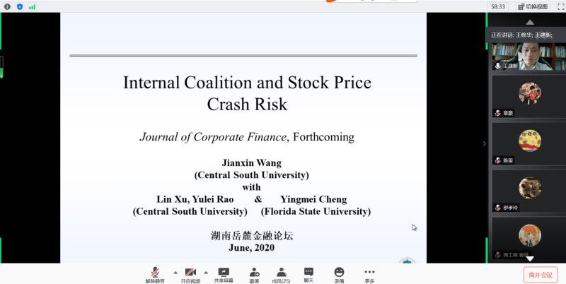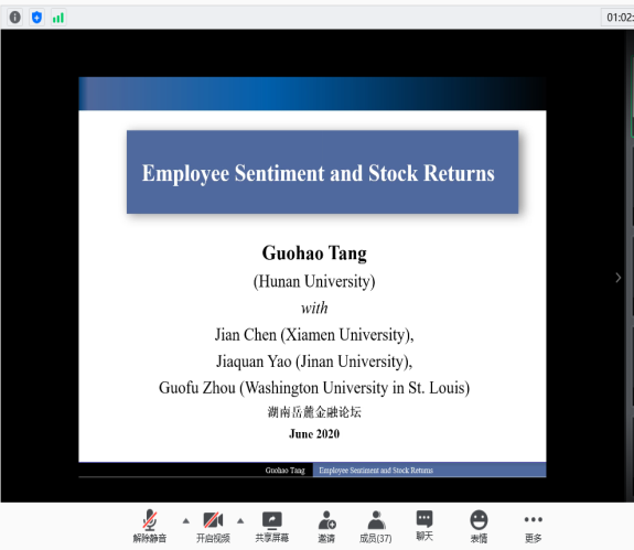 2020年6月13日,由日韩av 主办,联合中南大学商学院、湖南师范大学商学院、湘潭大学商学院、长沙理工大学经济与管理学院和湖南工商大学财政金融学院发起的首届“湖南岳麓金融论坛”线上召开。日韩av 院长潘敏教授致开幕辞,他表示非常期待省内六所高校联合的首次金融开讲,并与各位参会嘉宾分享了关于省内金融学术交流平台的构想与展望,希望今后各高校之间能有更多的学术合作与交流。本次论坛设立三个分论坛,共有126名师生参加此次线上论坛。
