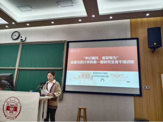 10月23日下午,开班仪式在财院校区二教101举行。学院党委副书记颜李作开班动员,他强调研究生干部要加强理论学习,领会上级文件精神,培养优良工作作风与团结协作精神,妥善处理工作学习的关系,并希望全体研究生骨干把握此次培训机会,奋发有为,练就本领,不断推动我院研究生工作再上新的台阶。随后,研究生辅导员周斌作了讲话,要求全体研究生骨干应不忘初心使命、全心全意服务研究生同学,应将新生升学的压力转化为前进的动力,不断探索新的出路,找到适合自己学习生活的方式方法。研究生会骨干周诗岚作为全体培训学员代表进行了发言。开班仪式由学院研究生会主席王雪雯主持。