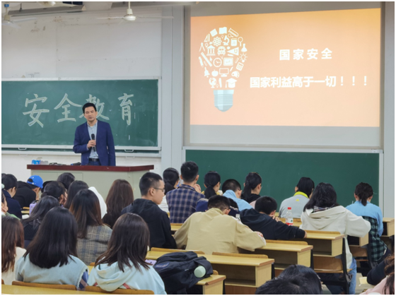 在二教502会场,朱群峰向同学们细致讲解了大学生安全的十个方面,提出了要以国家安全为重、做到“三防两反”。在讲解人身财产安全时,朱群峰结合贴近大学生生活的典型案例,温馨提示同学们不要上当受骗,并给出了避免陷入骗局的方法。沈新强围绕“卫生安全教育”这一主题,从大学生的健康知识普及生命安全保护、各类疾病就医方式、传染病防控等方面进行了生动讲述,阐明了校医院统一评估病情的作用,纠正了同学们“生病就要去大医院”的错误认知,普及了传染病传播途径、临床表现、预防措施等相关知识,并重点讲述了新冠肺炎,建议同学们勤开窗通风、勤洗手、保证充足睡眠。
