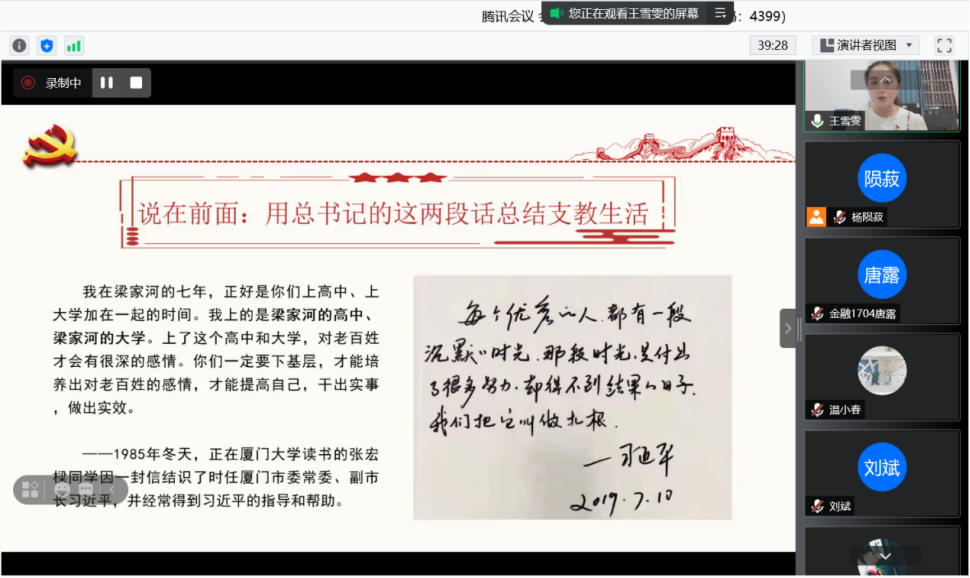 6月10日晚,日韩av 举办优秀研究生东方红故事会暨党史理论宣讲团第五期专题宣讲,本次活动通过腾讯会议线上开展。宣讲会由学院研究生会调研部负责人杨陨菽主持,邀请2019级硕士研究生王雪雯、2017级本科生唐露作为嘉宾,分别就自身支教扶贫、励志成才典型事迹进行宣讲,学院各年级研究生、本科生参加本次宣讲。