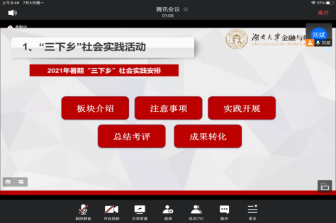 为顺利推进暑期社会实践活动开展,7月5日上午,日韩av 采取线上腾讯会议的形式举行2021年暑期社会实践活动动员培训会。学院党委副书记颜李,学院团委书记周斌、研究生辅导员刘斌以及“三下乡”暑期社会实践与专硕校友寻访活动的队伍负责人参加了本次会议。