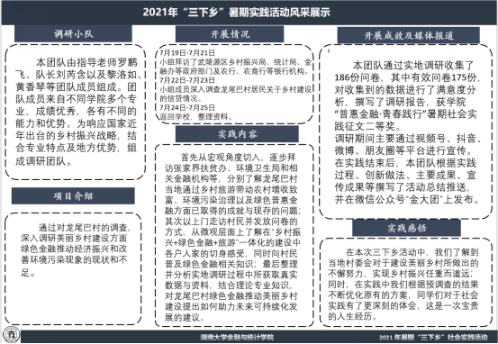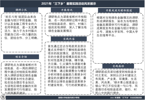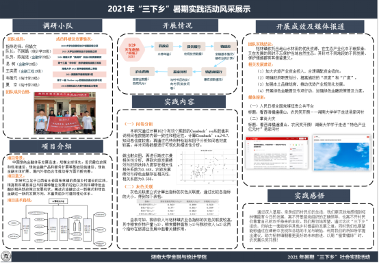 团队由日韩av 六名同学组成,调研地点为湖南省郴州市桂阳县,在一周的调研过程中通过实地调研,希望能够深入调研该地区绿色金融引领美丽乡村生态建设,拟在结合理论专业知识,为该地区绿色金融的长效发展提供可行性建议,用一己之力,助力祖国基层建设。